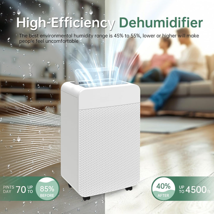 【Efficient Dehumidification】Our PhiloDeco Household Dehumidifier Can Effectively Remove Up To 70 Pints Of Water Per Day (At 95 ° F And 90% Relative Humidity) In Large To Medium-Sized Rooms Covering An Area Of 4500 Square Feet. It Is Very Suitable For Various Rooms, Such As Basements, Bathrooms, Bedrooms, Closets, Offices, Apartments, Garages, Kitchens, Laundry Rooms, Storage Rooms, And Rvs. The Smaller The Room, The Better The Effect. 【Powerful Compressor】This Bedroom Dehumidifier Is Equipped With A Powerful Air Compressor That Can Suck Moist Air Into A Coil Filled With Coolant. Equipped With Automatic Defrosting Function, This Means That When Frost Forms On The Evaporator Coil, The Compressor Will Cycle Off While The Fan Continues To Run Until The Frost Disappears. Condensed Moist Air Drips Into The Reservoir From The Coil, Discharging Dry And Fresh Air Into The Room. 【Easy To Move And Clean】This Dehumidifier Suitable For Large Spaces Has Handles And Wheels, So You Can Freely Move The Position Of The Dehumidifier At Home To Meet The Dehumidification Needs Of Different Spaces. The Detachable Filter Mesh Is Also Easy To Clean And Maintain, Ensuring That The Dehumidifier Continues To Perform Its Best Function And Prolongs Its Service Life. 【Manual And Automatic Drainage】Say Goodbye To The Trouble Of Constantly Emptying The Water Tank, And Enjoy A Seamless Dehumidification Experience With Our Humanized Dehumidifier. This Basement Dehumidifier Has A Built-In 11.2 Pint Water Tank. When The Maximum Capacity Is Reached, A Red "Full" Indicator Light And A Beep Alarm Will Sound To Remind You. For Added Convenience, Our Dehumidifier Is Also Equipped With A 47-Inch Drainage Hose For Continuous Drainage. 【 Worry Free After-Sales Service】Before Using The Dehumidifier For The First Time, Please Let It Stand For 2 Hours And Ensure That The Refrigerant Pressure Inside The Embassy Is Balanced Before Use. If You Have Any Initial Defects Or Other Issues With Our Bedroom Dehumidifier With Drainage Hoses, Please Feel Free To Contact Our After-Sales Email And We Will Solve Them For You As Soon As Possible