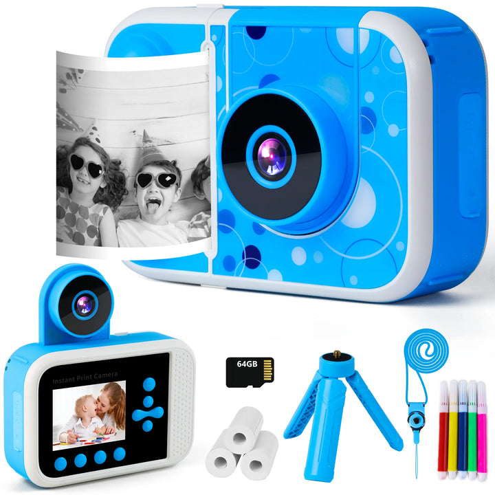 1* Instant Print Camera-Blue, 1*Type-C Charging Cable, 1*64GB SD Card, 1* Tripod, 3 * Rolls of Print Paper, 5 * Colored Pencils, 1* Lanyard,1* User Manual