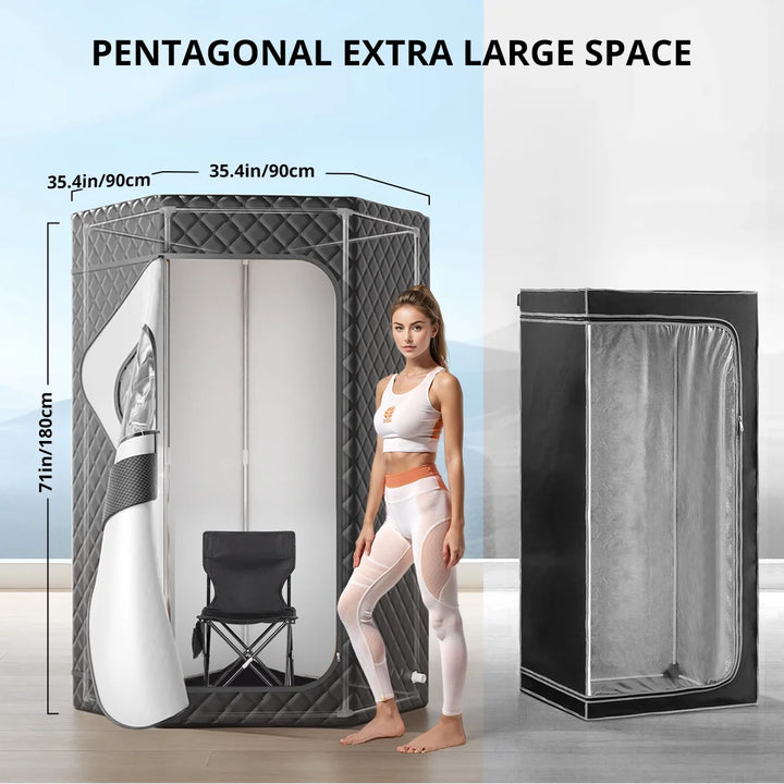 Spacious DesignThe steam sauna box adopts a novel pentagonal design. The size of the sauna tent is suitable for most people tall. You can stand or sit in it. The home sauna tent is equipped with a waterproof folding chair, allowing you to enjoy the personal sauna more comfortably.