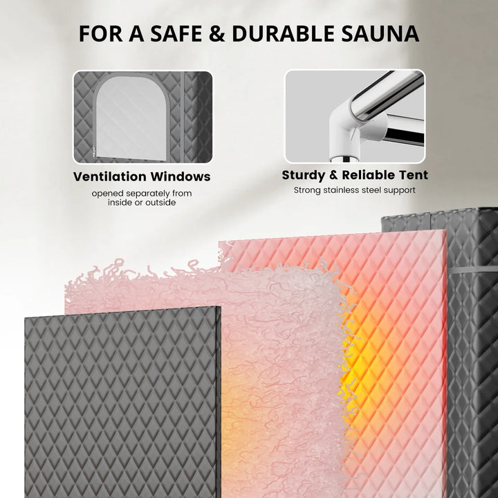 Safe and Durable DesignThe steam boiler liner is made of rust-proof and durable 304 stainless steel. The indoor sauna tent is made of thickened warm cotton, breathable oxford cloth and heat retention polyester satin, which preserves heat, dries quickly, and is easy to clean. The sauna tent uses strong stainless steel pipe, which is rust-resistant and durable. The indoor sauna tent kit doesn't produce chemical odors.