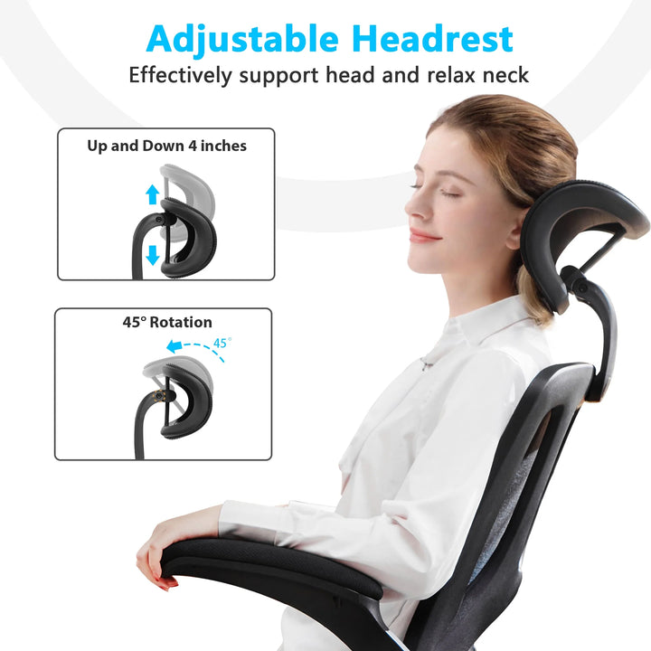 - 【Adjustable office chair】The adjustable headrest, and height-adjustable feature of this home office desk chair allow you to customize your sitting experience to meet your specific needs. Whether you are working, gaming, or simply relaxing, this chair has got you covered.The adjustable flip-up armrests allow you to customize your seating position, Folding the armrests up 45°, you can push the executive office chairs directly under the desk to save valuable space.
