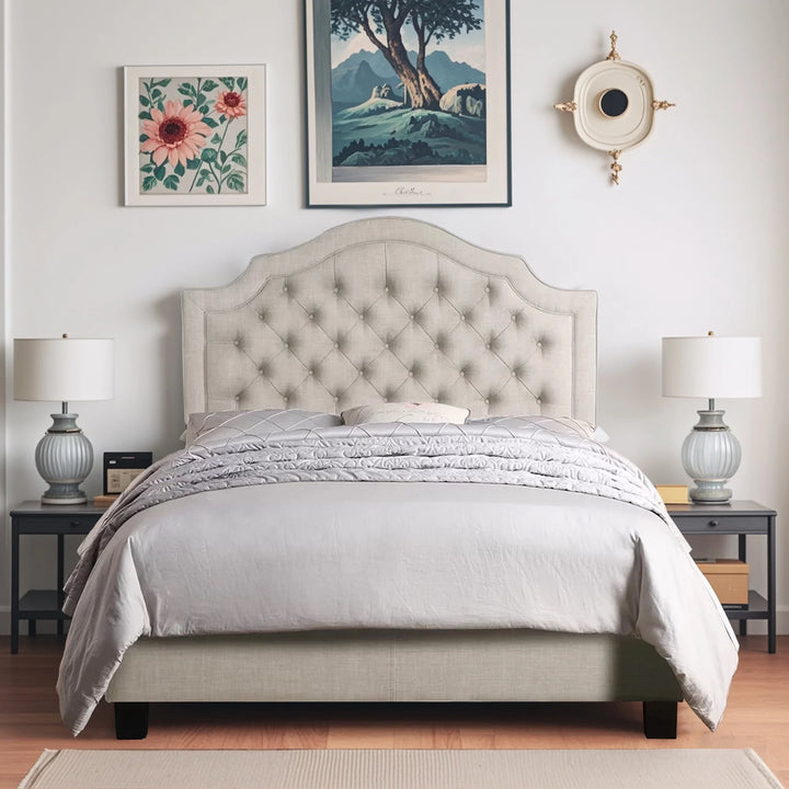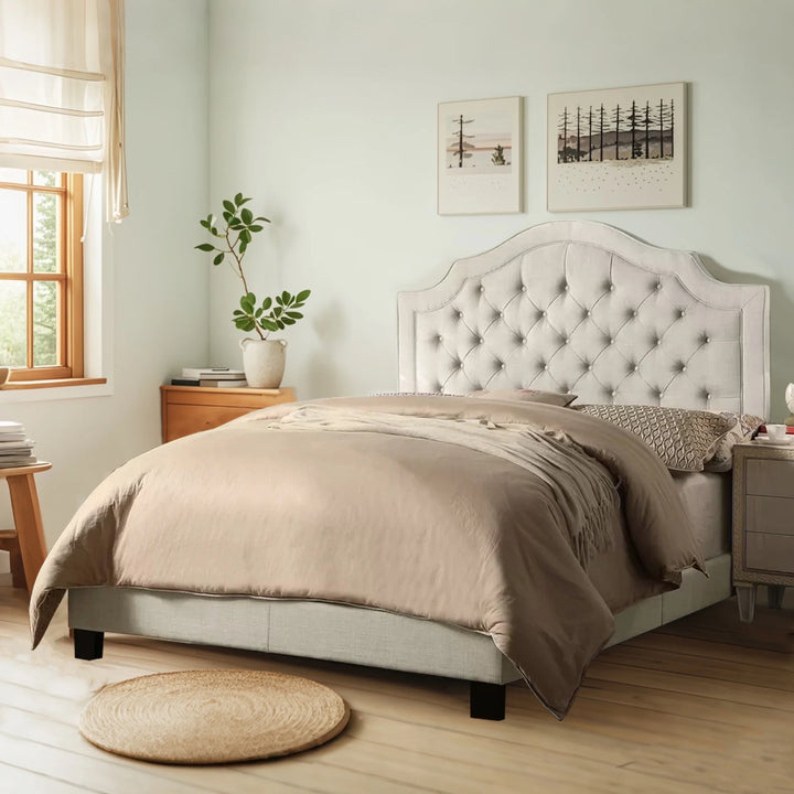 Anchor your bedroom in clean, transitional style with this romantic panel bed. Crafted of solid poplar and rubberwood, padded with premium foam, and enveloped in brushed linen upholstery, the elegant crown-arched headboard is accented by deep button tufting and attractive piping for a tailored touch, while clean-lined side and foot rails fill out the frame. A set of wooden slats and center supports accommodate your preferred mattress, while four tapered square legs provide 4" of clearance for valuable underbed storage. Hurray!