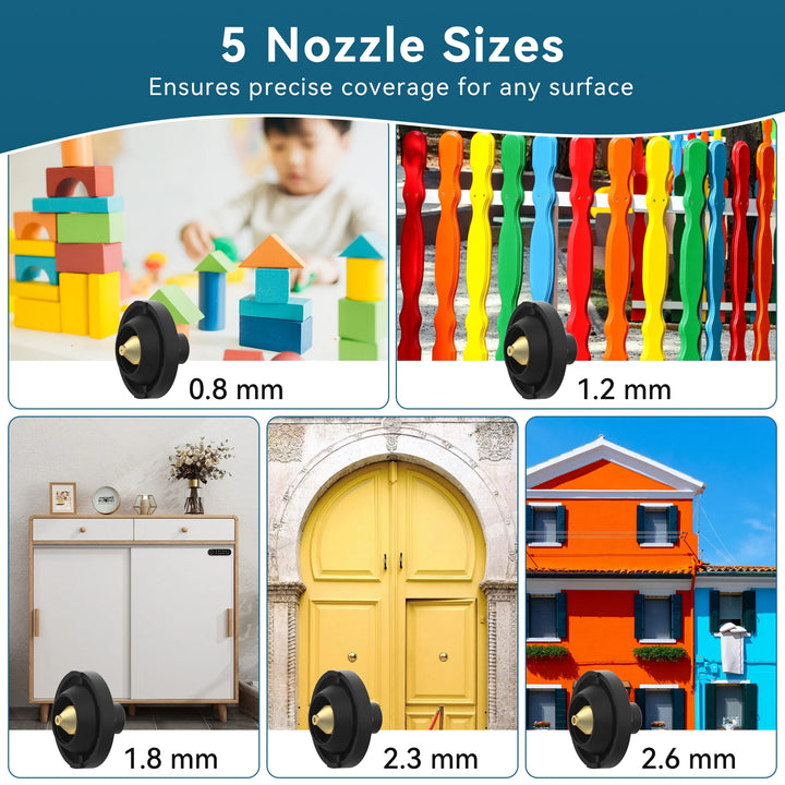 - 5 Nozzle Sizes & 3 Spray Patterns: 800W high power spray paint gun comes with 1 X 1400ml High-capacity Container, 5 X Copper Nozzles (0.8 mm, 1.2 mm, 1.8 mm, 2.3 mm, 2.6 mm), 1 X Paint Filters, 5 X Paper Funnels, 1 X Cleaning Needle, 1 X Cleaning Brush, 1 X Viscosity Cup, 1 X Pair of Gloves, 1 X User Manual. Multiple nozzles sizes and 3 adjustable spray patterns(horizontal, vertical, and circular) allow for a wide range of application scenarios.