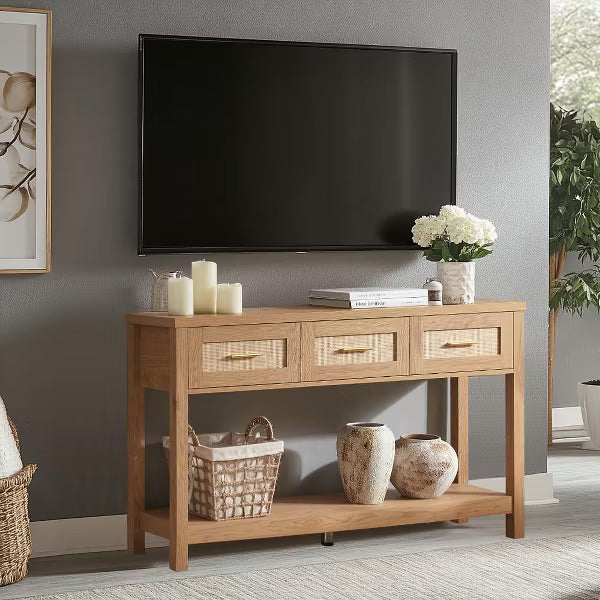 【Natural Boho Console Table - Elevate Your Home Décor】 Transform your living space with our Natural Boho Console Table, a masterpiece that combines rustic charm with bohemian elegance. Crafted with a natural oak wood grain design, this entryway table features a clear, distinct texture that adds warmth and sophistication to any room. The rattan veneer-adorned drawers of our living room console tables exude a unique boho flair, making them a perfect addition to modern, rustic, country, or farmhouse decor styles. 【Stable & Sturdy Construction for Long-Lasting Use】 Built to last, our console table boasts a robust construction that ensures durability and stability. The tabletop and bottom shelf are made from thickened MDF panels, while four reinforced legs and an additional metal leg enhance the bottom shelf's load-bearing capacity. The anti-toppling device provides extra safety, making it ideal for families with children. This sturdy entry table securely holds heavy items, offering a reliable piece of furniture for any home. 【Versatile Storage Solutions for Organized Living】 Stay organized and stylish with our long foyer tables for entryway. Featuring a 51.18" x 11.81" tabletop, 3 drawers, and an open shelf, these narrow hallway tables offer ample storage and display options. The drawers are perfect for storing magazines, keys, and other essentials, while the lower shelf can accommodate larger items like baskets and shoes. The smooth tabletop is ideal for showcasing plants, photo frames, and more, adding a touch of elegance to your space. 【Multi-Functional Console Table for Every Room】 Our versatile console table is a true multi-tasker, serving as an accent table, couch table, foyer table, entrance table, bar table, display shelf, front door table, TV stand, plant stand, window table, or coffee bar station. Its adaptable style complements various home décor, making it perfect for the bedroom, living room, kitchen, or hallway. Whether you're looking to add functionality and elegance to your space, this console table is the ultimate solution. 【Effortless Assembly & Reliable After-Sales Service】 We understand that assembly can be a hassle, which is why we provide detailed installation instructions and coded parts to make the process a breeze. All parts are clearly labeled, ensuring you can follow the instructions with ease. Plus, our console tables for entryway come with 24-hour friendly customer service and a 12-month quality guarantee, giving you peace of mind and ensuring your satisfaction. Don't miss out on this opportunity to elevate your home décor with our Natural Boho Console Table. Order now and experience the perfect blend of style, functionality, and durability! Kadyn Console Desk Table, Console Table, Entryway Table, Side Table, Display Table,Console Table with Rattan 3 Drawers, 2 Tier Long Behind Couch Table, Bedroom