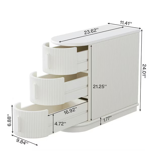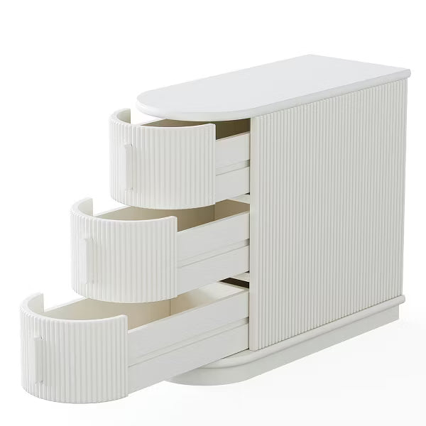 Enhance your space with this uniquely designed side table, blending distinctive style with practical functionality. Featuring grooved wooden drawers, it offers ample storage to keep essentials within easy reach. The table's Roman-inspired lines on the front and sides add a touch of timeless elegance, while the durable solid wood construction ensures stability and longevity. Arriving pre-assembled, you can enjoy your new side table immediately, without any setup hassle. This piece effortlessly combines sophistication with convenience, making it a perfect addition to any room. Resenkos Nightstand, Night Stand,Wood End Table, Narrow Side Table Nightstand with 3-drawer,White