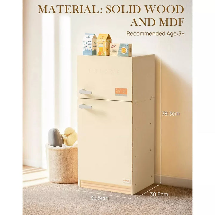 Charming Cottage Style Design: The creamy wooden toy fridge has a soft color palette and charming design, adding a cozy cottage feel to playrooms. It sparks kids' interest in imaginative food storage play.