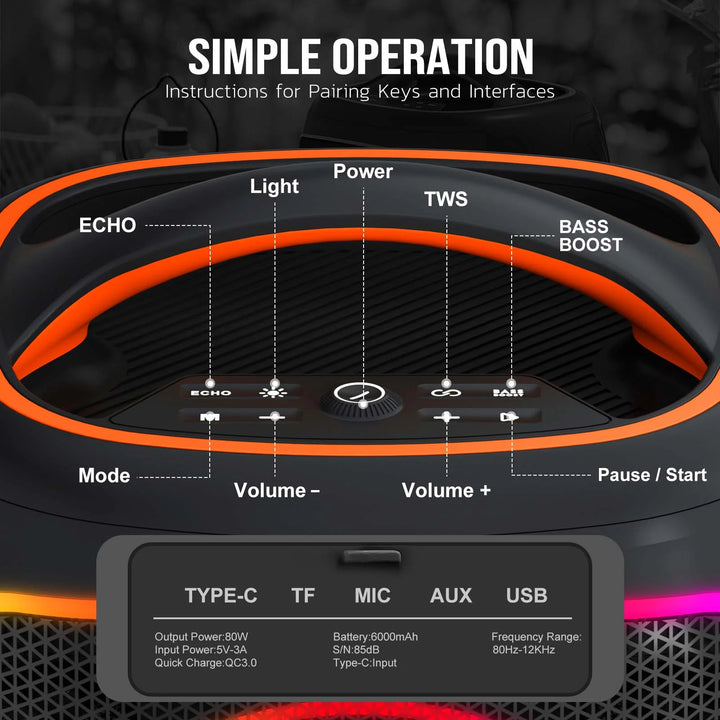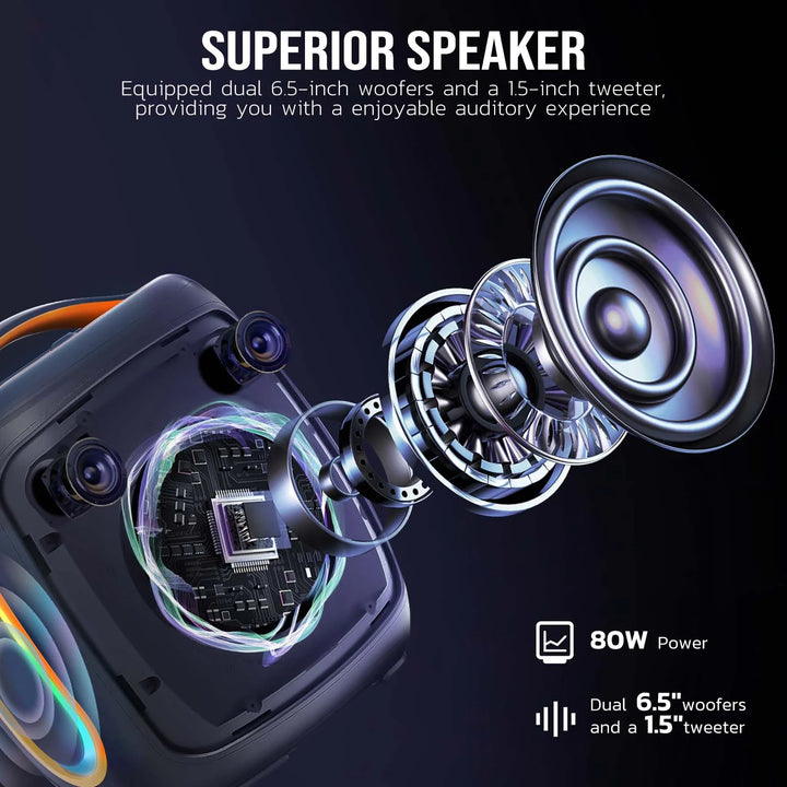 - Versatile Input Support: Compatible with Bluetooth 5.3, USB flash drives, TF cards, 3.5mm AUX, wireless/wired microphones, guitar input, TWS function, and FM radio.