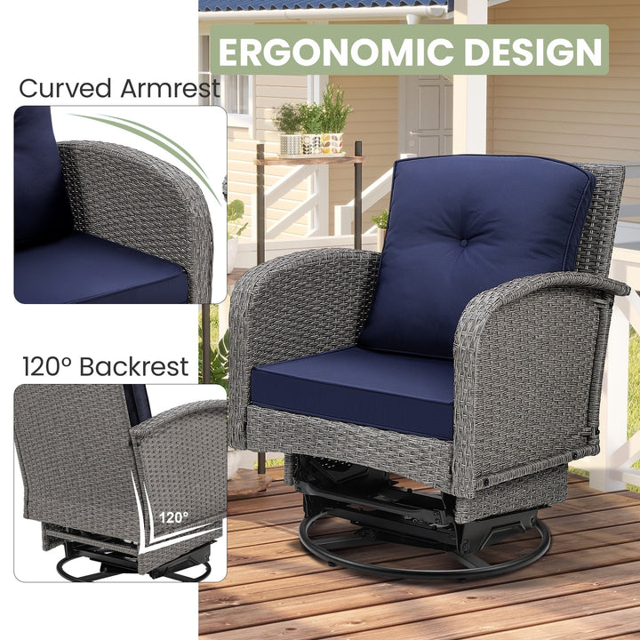 Segmart 360° swivel rocking chair set is the first choice for small outdoor furniture as it provides an all-round comfortable sitting experience. This outdoor bistro set is made of sturdy PE rattan, with a stable metal bottom that allows for constant rotation and swaying, and thickened cushions for a comfortable and resilient sitting experience. 3-piece patio swivel glider rocker includes two Spacious rocking chairs and a glass coffee table with shelf. After a simple 40-minute assembly, you can enjoy the beauty of the sunset on your patio or deck!