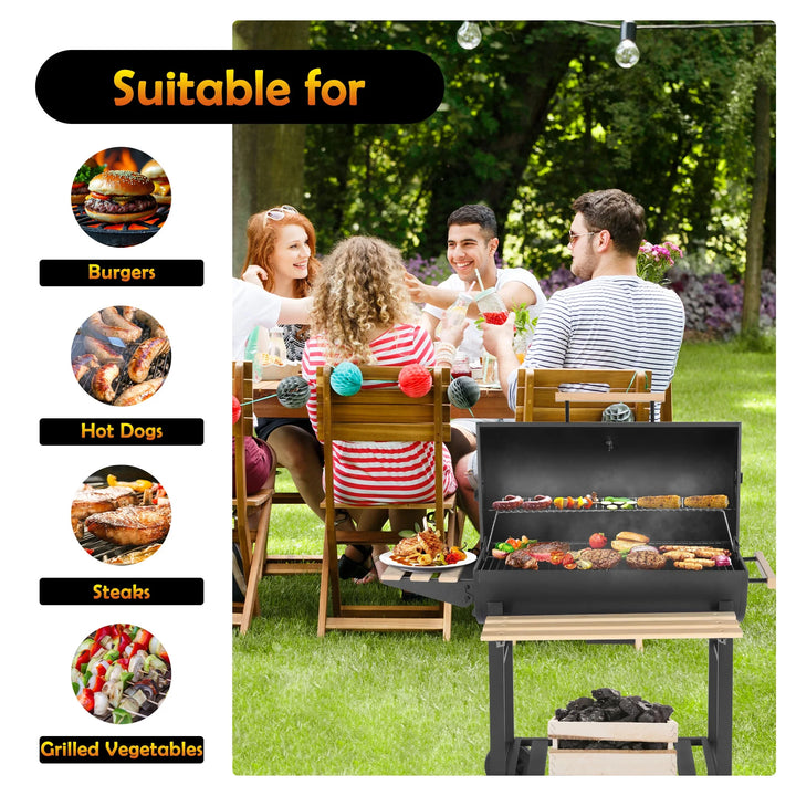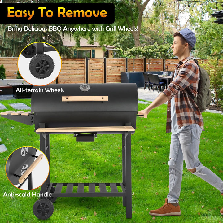 【PORTABLE CHARCOAL GRILL】 - Portable charcoal grills with steel lid. The durable 26-inch diameter of BBQ grill plated steel cooking grate provides ample cooking surface for any meal of your grilling. A perfect BBQ charcoal grill with wooden handles and durable wheels for outdoor camping by getting your friends or family hovering around the grill, hungry for a tempting charcoal flavor of burnt food.