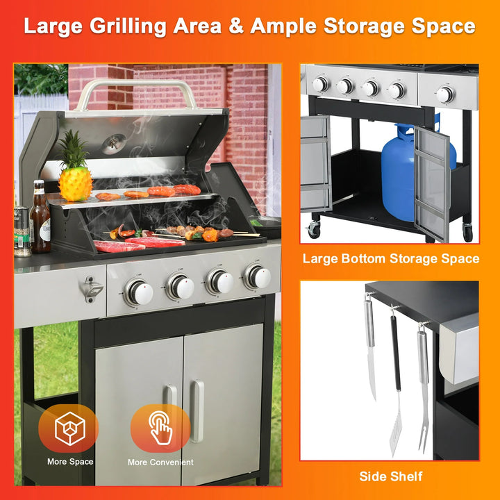 The grill can be used to prepare breakfast, lunch, and dinner for the entire family. This propane gas grill is perfect for any outdoor space like backyard, garden, courtyard, terrace and balcony of most family, alternative all season for outdoor cooking.It's ideal for preparing eggs, pancakes, bacon, steak, potatoes, and other grilled foods.