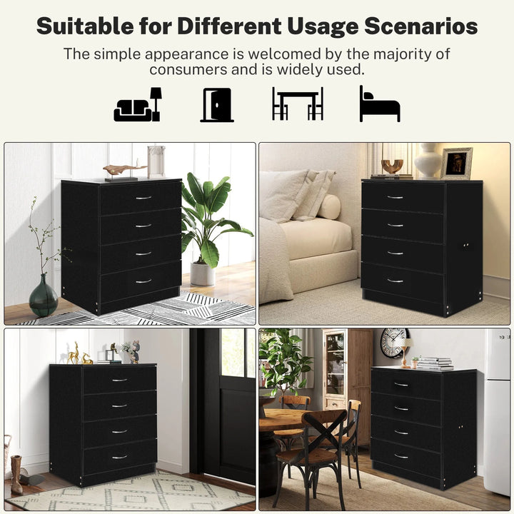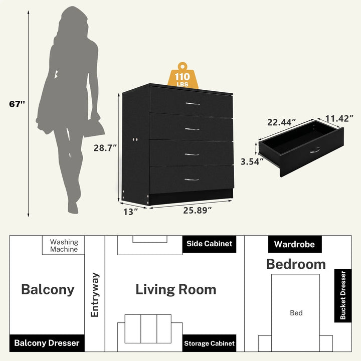 【TONS OF STORAGE SPACE】 - The black dresser with 4 drawers, glides smoothly on metal slides, you'll stay organized and tidy with this compartmentalized dresser. This dresser organizer with the vertical design fits easily in many smaller spaces while still providing plenty of storage space. Dimensions: 25.98'' x 13'' x 28.7".