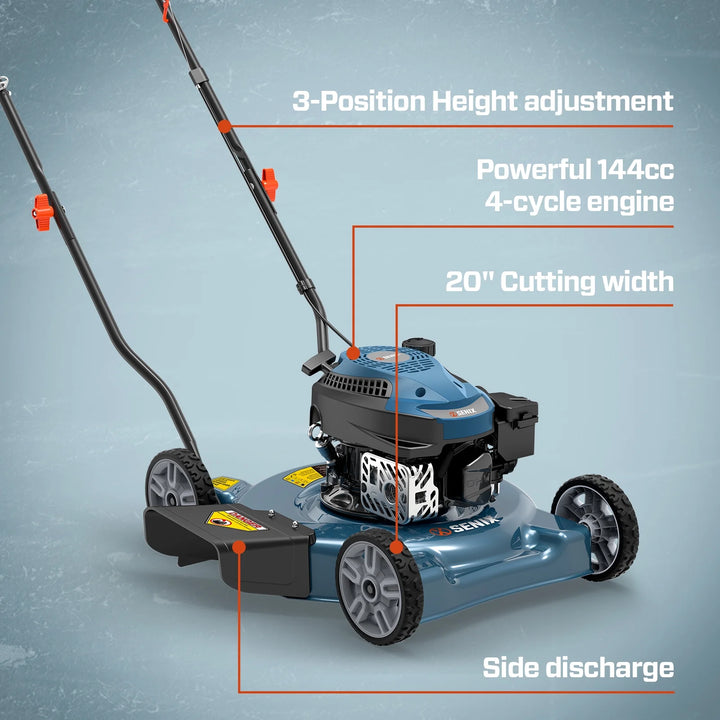 SENIX Gas Lawn mower, 20in, 144cc 4-Cycle Engine, Rear Wheel Drive, Steel Deck with Side Discharge, LSPG-L4