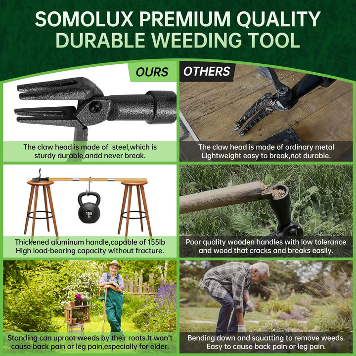- Comfortable Standing Design, No Need to Kneel - Our Stand Up Weed Puller Tool has a long handle, which allows you to weed without bending or kneeling, greatly reducing the burden on your body. It is perfect for the elderly and those with back lumbar discomfort,give grandpa’s weeder a new one.