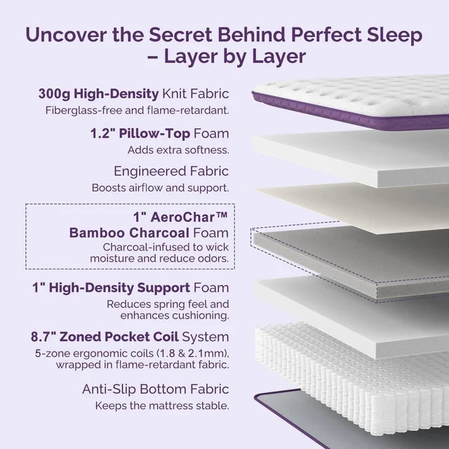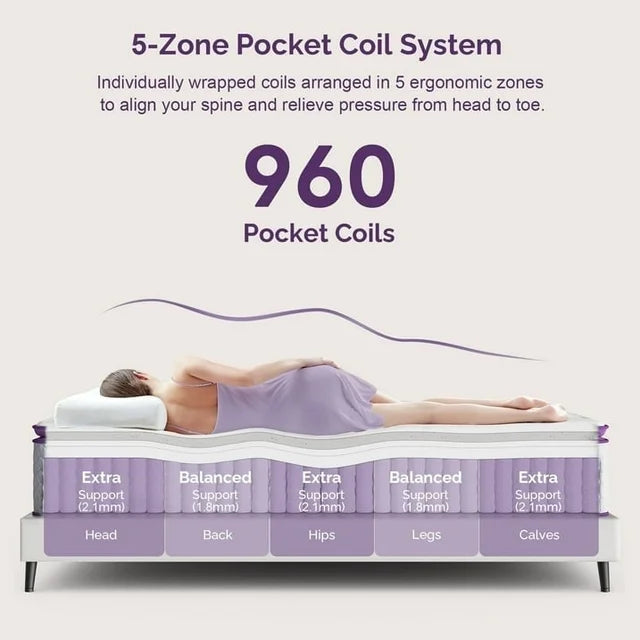 - Features: 5-Zone Support, Independent Pocket Springs, Breathable Memory Foam, Back Pain Relief, Pressure Relief, Motion Isolation, Cooling Sleepers, Fiberglass free , Mattress-In-A-Box, Antimicrobial