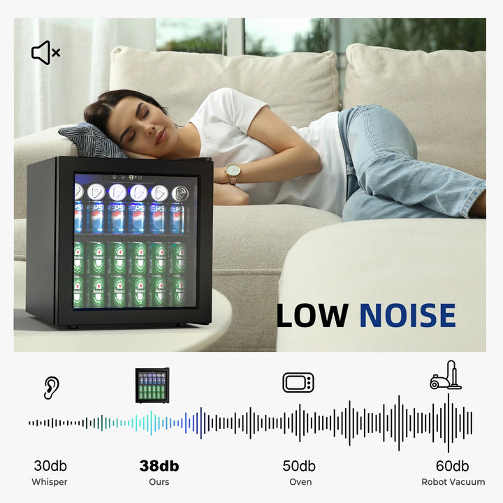 Introducing our fantastic mini beverage refrigerator with a spacious 55 cans capacity, perfect for storing a generous amount of beverages! Get ready to quench your thirst in style. With this mini beverage cooler adjustable temperature range from 32℉ to 50℉, you have the power to personalize your chilling experience like never before. Say goodbye to warm drinks and hello to refreshing coolness! Whether you're hosting a backyard party, or simply enjoying a relaxing day at home, this mini drink fridge is your ultimate beverage companion. Its ample capacity ensures you'll never run out of your favorite drinks, keeping you and your friends hydrated and satisfied. -Product Size:16.93L*16.26W*18.54H IN