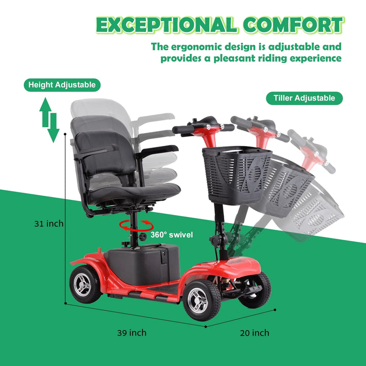 EASY TO TRANSPORT: Quickly disassemble the SKMC mobility scooter into four separate pieces for easy portability. Featuring a folding tiller and removable seat, each section easily fits in the trunk of standard size vehicles.