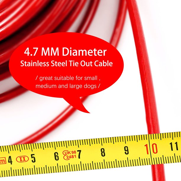 - Heavy Duty Tie Out Cable: Our dog tie out leads for outside 30 feet for dogs is strength tested for Dogs up to 250 pounds with 4.7mm diameter stainless steel wire rope. Our Dog Tie Out Cables are a great choice for restricting your dog's outdoor mobility while granting room to roam, romp and investigate.