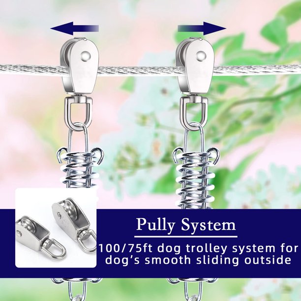 - HEAVY DUTY DOG TIE OUT CABLE:The Aerial Run Trolley System comes with a 100 ft dog tie out cable and a 10ft dog runner zipline, which are vinyl covered to protect from rain and rust, durable and long lasting for large dogs up to 125 lbs. Turnbuckle is included to avoid sagging and help pulley run smoothly along the cable.