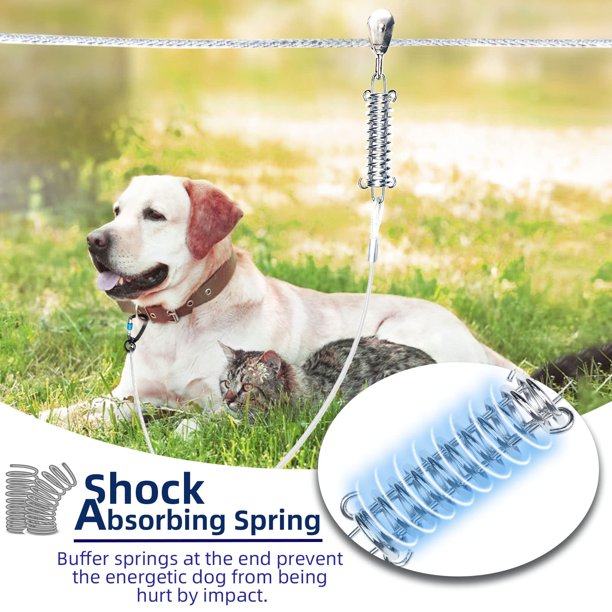 - ANTI-SHOCK DOG RUNNER LINE:The shock absorbing spring is located on the runner lead instead of the cable, help your dog reduce the tension more directly to avoid injury, give your pet more freedom and security to run in the yard.