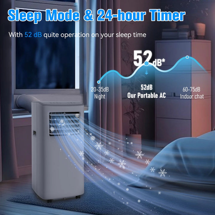 - Sleep Mode & 24-hour Timer : Activate the Sleep Mode on our portable air conditioner that activated by pressing Increase and Speed simultaneously, ensures energy-saving and featuring an ultra-low noise level of 52 dB. Drift into a peaceful slumber without disturbance, And take control of your comfort with the built-in 24-hour timer, Customize the cooling duration to suit your lifestyle, ensuring a refreshing environment whenever you need it.