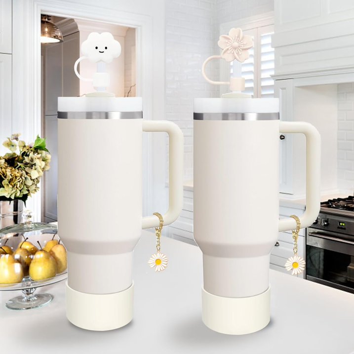 - [Package Include]: Our cup accessories for stanley cup include 2pcs 0.4 Inch/10 mm cute straw cover cap, 1pcs flower handle charm, spill proof stopper set and 1pcs silicone boot for stanley. Compatible with Stanley Quencher 30/40 oz and Stanley IceFlow 20/30 oz tumblers water bottles & others cup bottom diameter 2.75-2.95 inch