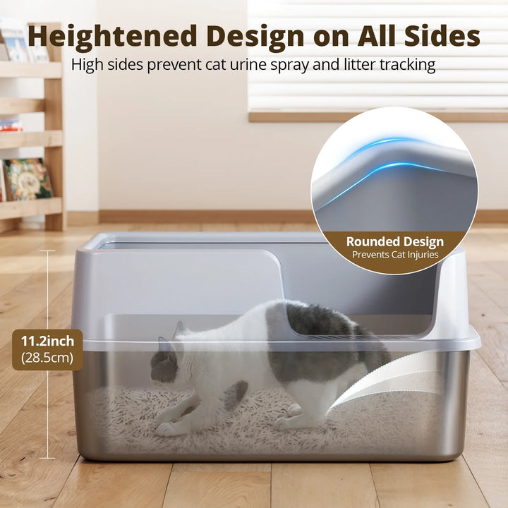 - 😸【Exclusive Design 】The 30° angled litter filter plate in the Novashion Stainless Steel Cat Litter Box offers a specific advantage by preventing cats from easily removing litter. The extra-large stainless steel cat litter box has a height of 11.2" and features a unique curved high wall design of 6" to protect your cat's privacy and prevent litter from spilling and urine from leaking. This design can be particularly beneficial for keeping the surrounding area clean, thereby reducing the need for constant cleanup.