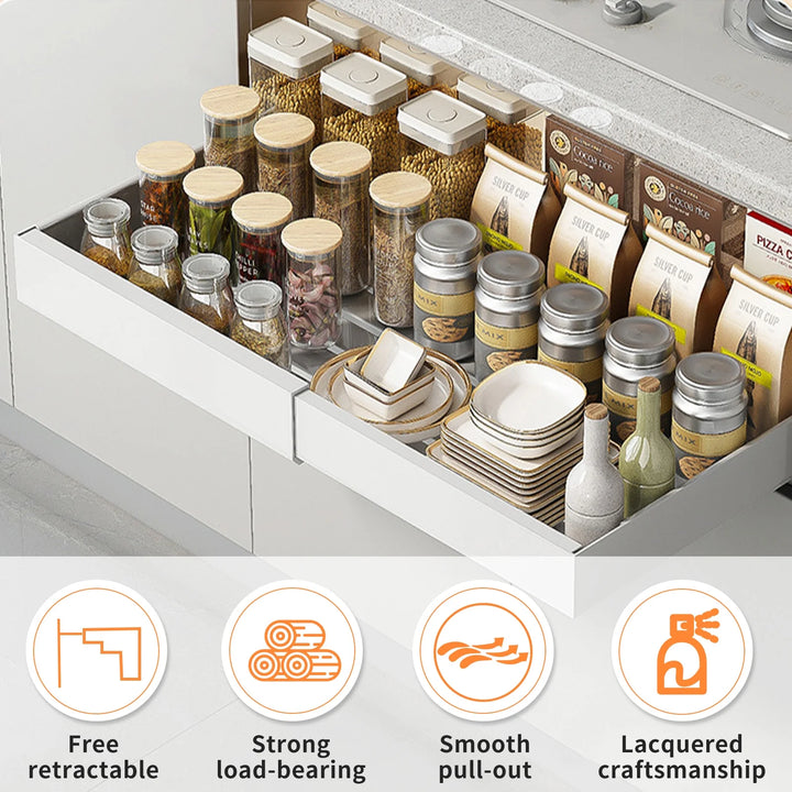 • Crafted from rustproof carbon steel, these pullout cabinet organizer shelves laugh at spills and scratches. Load them with cast iron pans or glass jars—330 lbs of weight vanishes behind cabinet doors, yet stays ready in a slide.