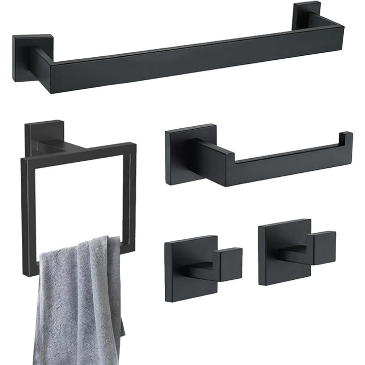 - This black bathroom hardware set includes a 15.8" towel bar, a towel ring, a toilet paper holder, and 2 robe hooks, providing everything you need to keep your bathroom organized and stylish. The perfect combination of functionality and modern design, this black towel bar set ensures no product goes unused, making it a must-have for any home.