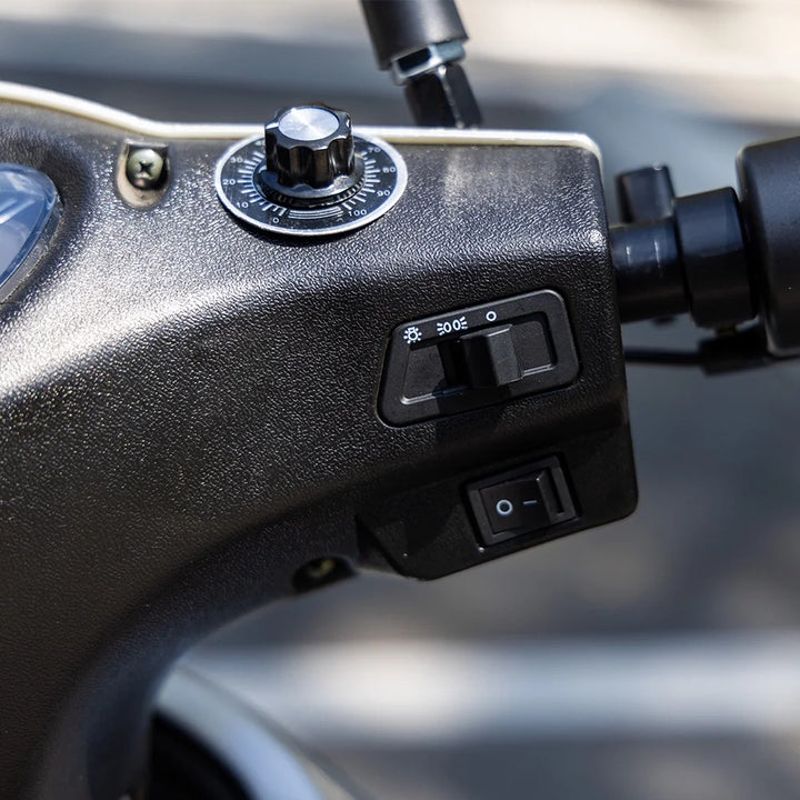 - 4. VERSATILE:front headlight with high/low beam, rear running/brake lights, horn, LCD monitor screen, front and rear brakes, speed control, parking brake, rearview mirrors, turn signals, 2 storage space, remote key, phone holder and usb charger port. The scooter ensures visibility and compliance with road regulations.