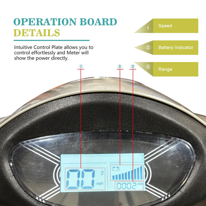 - 6. SAFE: Equipped with safety belt and anti-tipping roller. Anti-theft system and siren warning function, front shock absorbers and a 4.5" ground clearance contribute to a smooth and secure ride even on uneven terrain.