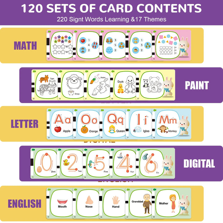 - The talking flash cards learning toys contain 120 pcs flash cards, which include 240 words.