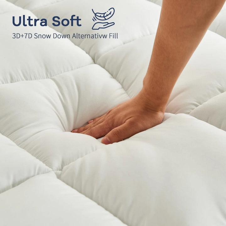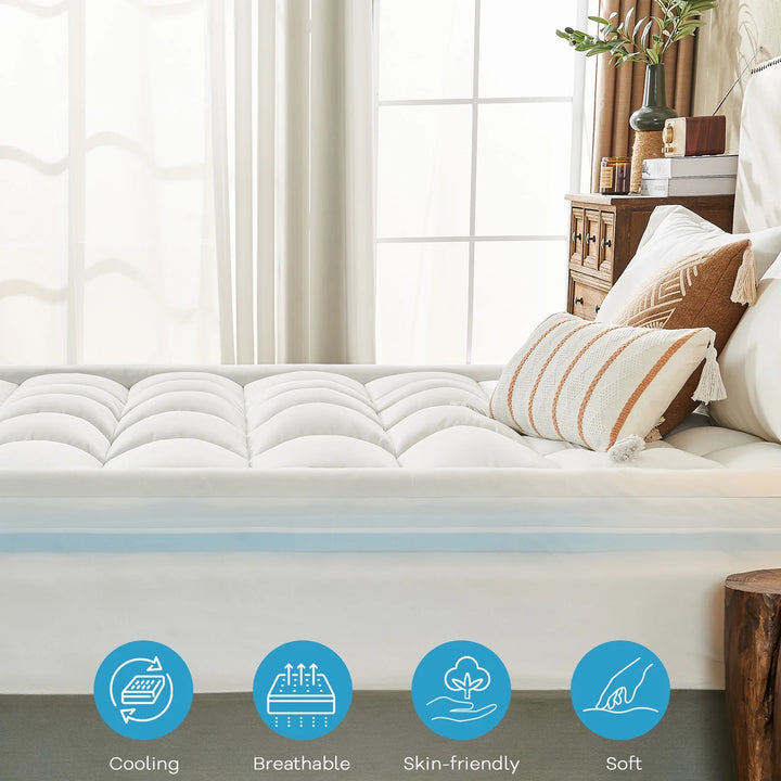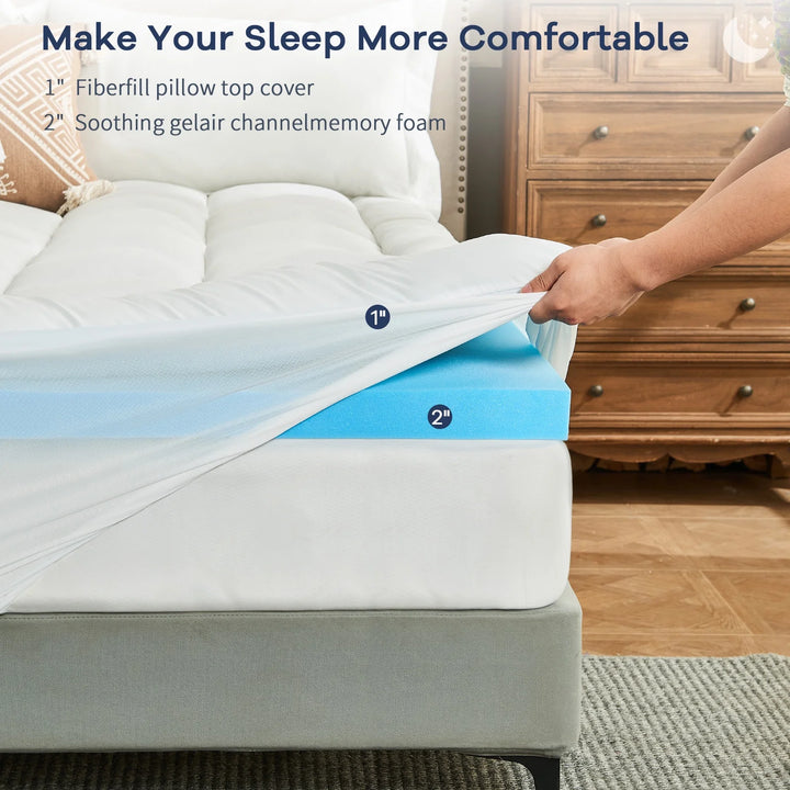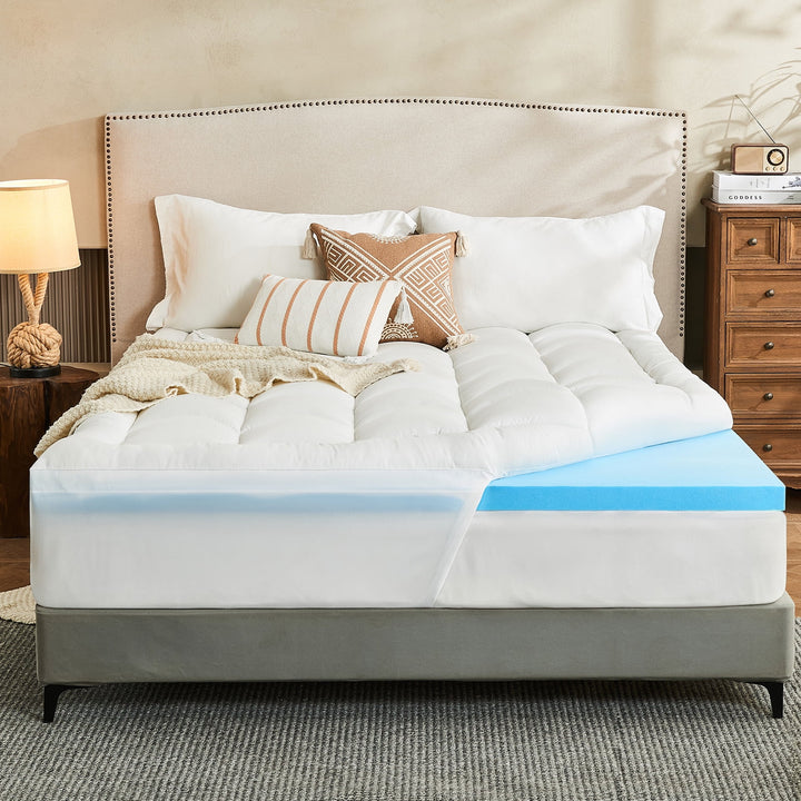 - 【DOUBLE LAYER DESIGN】Equipped with a 2-inch queen memory foam topper filled with cooling gel and a 2-inch down replacement mattress pad. The plush and soft mattress adds an extra layer of comfort, making you feel like sleeping in the clouds. Adding foam to the top of an old mattress is the perfect way to add extra softness to a solid mattress without replacing an expensive mattress.