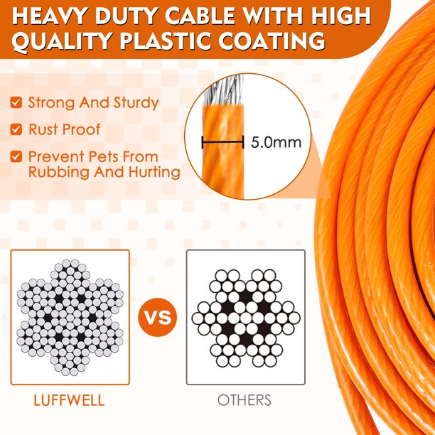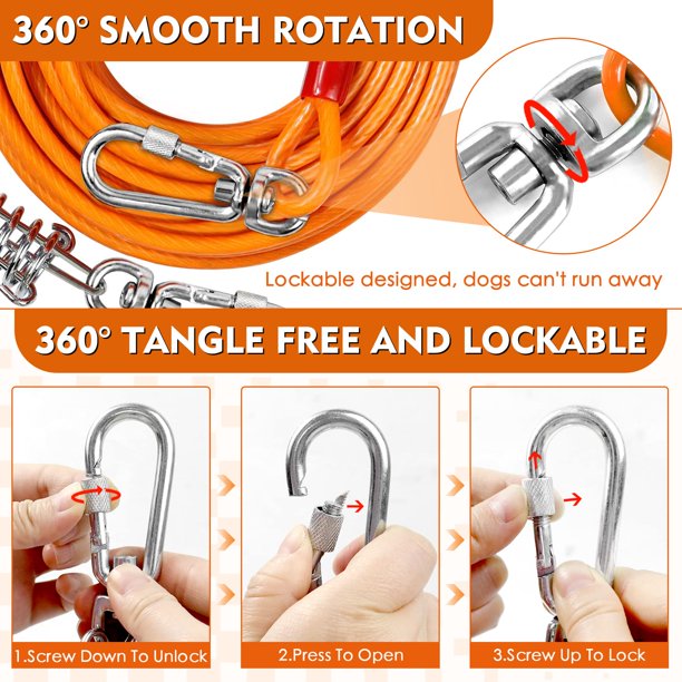 - RUSTPROOF & REFLECTIVE CABLE: The dog tether for yard is coated with Vinyl which plays the role of waterproof and rust-proof. It is also anti-corrosion and durable, no matter how badly your dog bites, the cable won't break. Bright orange in color and reflective design applied, this leash cable will help you quickly locate your pets anywhere even at night;