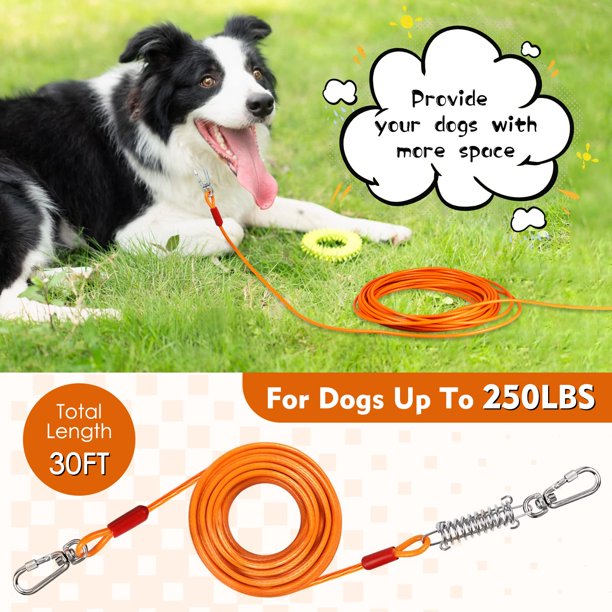 - LONG AND HEAVY DUTY: 30ft in length and 5.0mm in diameter. This dog outdoor leash cable is much thicker than normal dog leashes. High-quality plastic coating wraps the tightly intertwined 100% steel wires prevents pets from rubbing and hurting. Both ends of this tie out cable are welded with superior alloy steel, supports small, medium and large dogs up to 125 lbs. High quality materials and reasonable design allow your pets more room of activity with safety guaranteed;