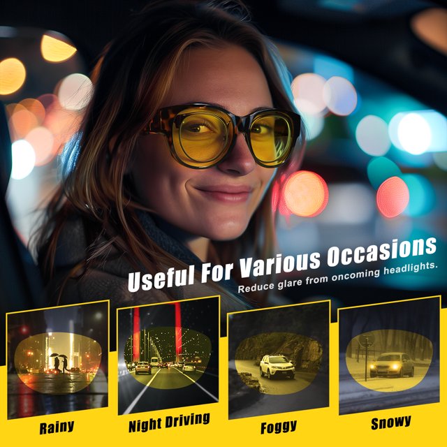 Our polarized yellow tinted lens effectively reduce glare caused by oncoming intense headlights and bright streetlights, enhance night clarity and alleviate eye fatigue, making night driving safer.