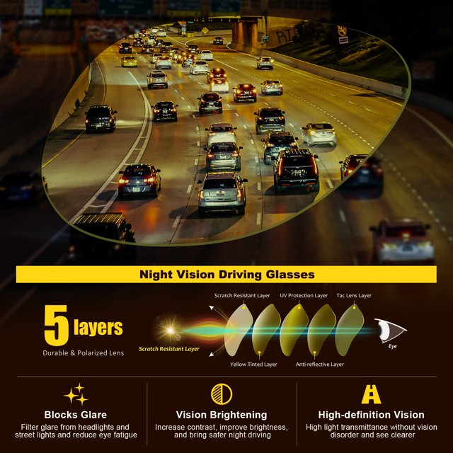 - Polarized Yellow Lenses: Night vision glasses effectively reduce the glare caused by oncoming strong headlights and bright street lights. Prevent dazzling lights to distract you from the road and keep you safe when driving.