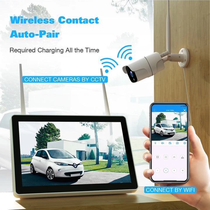 The wireless security camera with hard drives has a 12.1" full HD 1080P LCD display (non-touchscreen) and 4 paired network cameras. No network is needed. Just plug the power cord into the NVR display and surveillance camera, and it will display 2MP video. (The camera and screen can be connected via CCTV, but need to be plugged in to work).