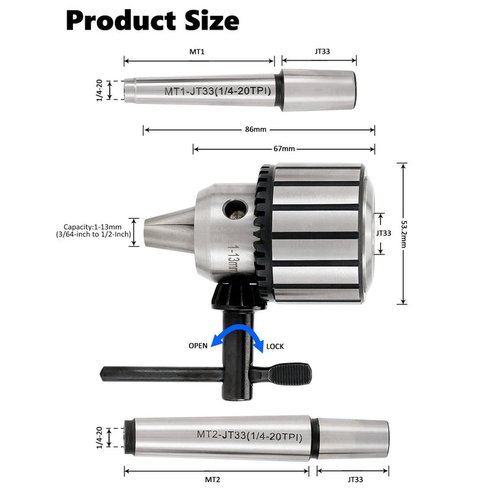 - Woodworking Tool Set: Get all your drilling needs in one place with this toolkit, which includes a 1/32" 1/2" drill chuck set (JT33), two Mose tapered arbors (JT33-MT1 and JT33-MT2), and a chuck key