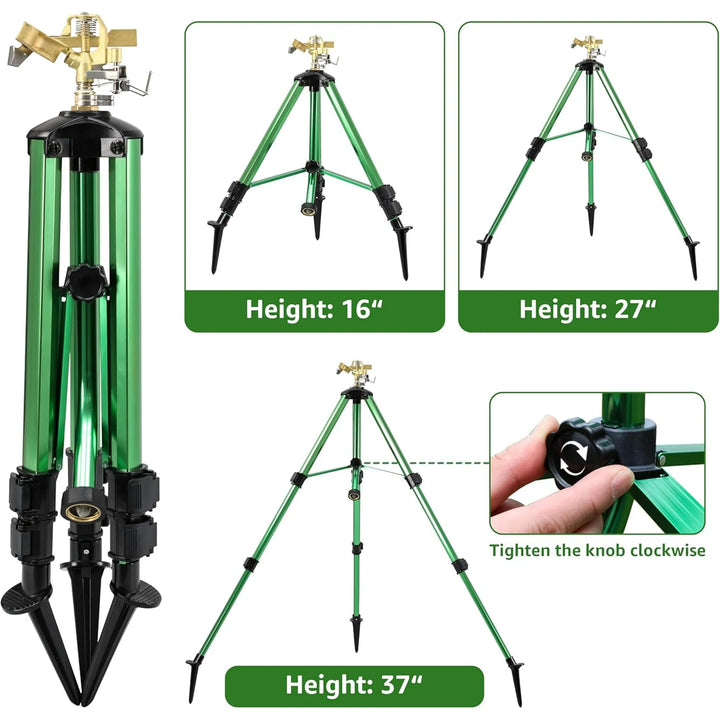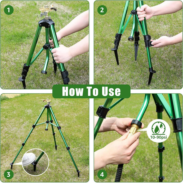- Equipped with heavy-duty high-quality brass impact sprinkler head and sturdy tripod stand, our sprinkler is waterproof, corrosion-resistant, and ruggedly durable, enduring the test of time for long-term use. Whether it's the scorching sun of summer or the harsh cold of winter, it effortlessly copes.