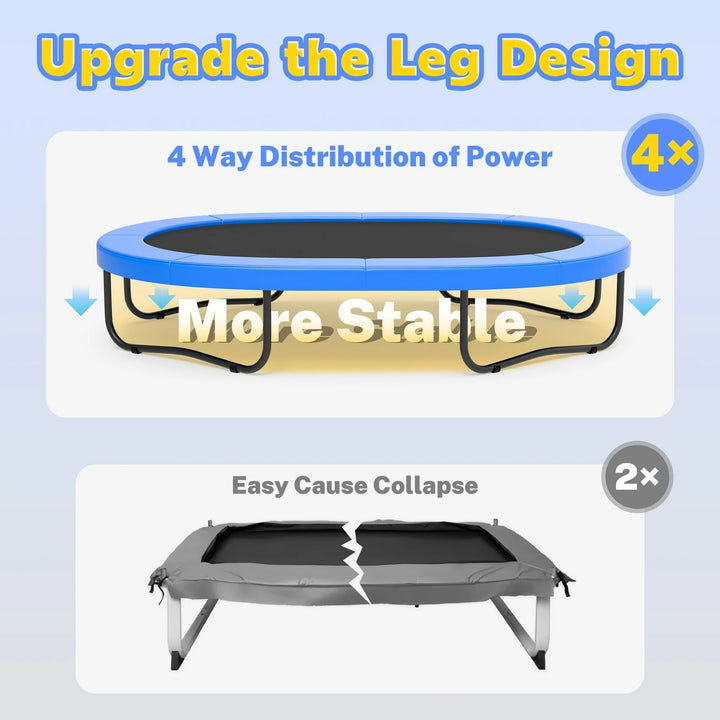 Recreational Trampolines with Enclosure Net boasts a revolutionary support system as four-corner foot structure. This innovative 4 W Design, compares with normal U leg, can make the trampoline maintain a high degree of stability when bearing weight. Experience unmatched safety with our robust and reliable trampoline build.