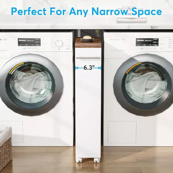 This slim storage cart will maximize your storage space even in the smallest spaces.6.3” width design is specially designed for narrow spaces. It can perfectly fit in the gap between the cabinet and fridge or any other tight spot to help organize your belongings conveniently and get rid of clutter. Equipped with a 3-tier open shelf and an added top, this narrow kitchen cart can accommodate all of your essentials with different heights easily to make your room neat and clean. The pull handle on the side and four 360 ° rolling casters make this free-standing slim rolling cart easy to move around without scratching your floor. At the same time, two caster wheels can be locked in place for secure use when it's stationary.