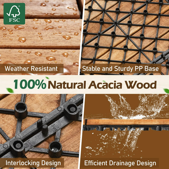 - 【High-Quality Acacia Wood】This interlocking deck tiles are made from 100% natural acacia wood and sturdy PP base. Crafted with top-tier workmanship, these patio tiles boast impressive smooth on the surface, firmness when step on and premium aesthetic look.