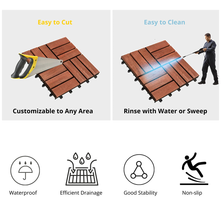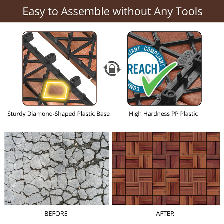 - 【High-Quality Acacia Wood】This interlocking deck tiles are made from 100% natural acacia wood and sturdy PP base. Crafted with top-tier workmanship, these patio tiles boast impressive smooth on the surface, firmness when step on and premium aesthetic look.