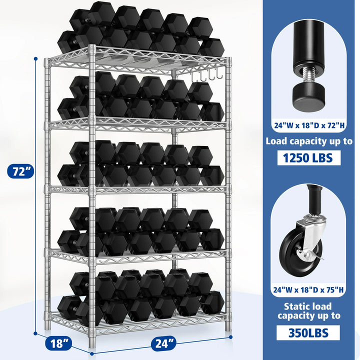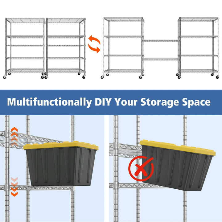 - 【DURABLE & STURDY CONSTRUCTION】The storage shelves can hold up to 1250lbs weight. The wire shelving unit use durable steel construction, and to resist dirt buildup and corrosion. The garage shelving with sturdy posts and wire meshes enable the unit to hold up to 250 lbs of evenly distributed weight. Maximum entire unit weight capacity is 1250lbs when equally distributed on casters. Wire shelving unit storage shelves garage shelving.