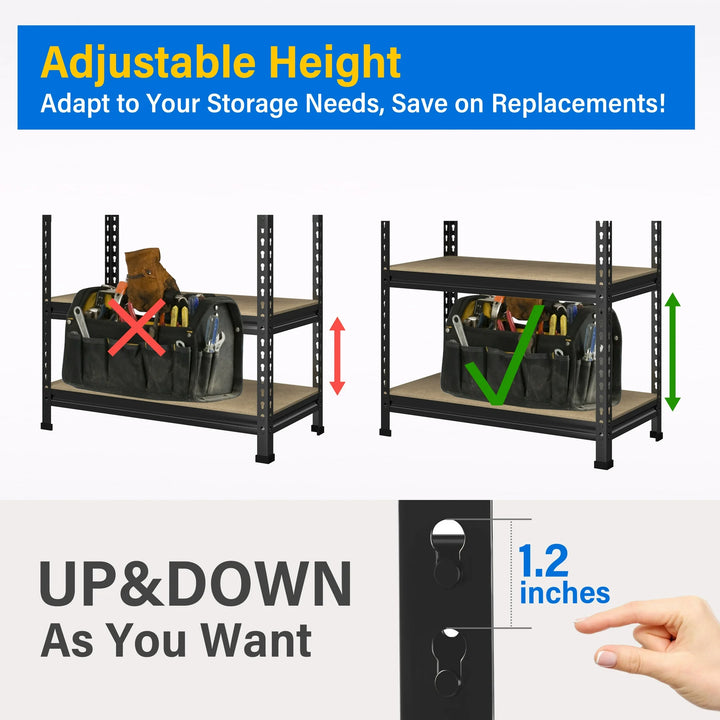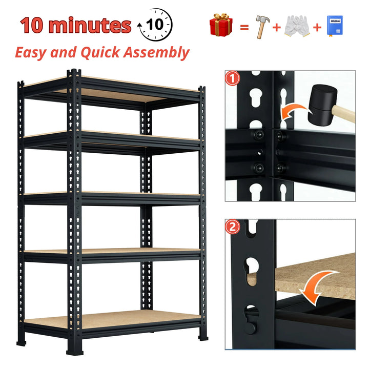 This heavy-duty storage shelves feature the high-strength thickened metal frame. The shelves is made of high quality medium-density fibreboard. They can enhance load-bearing capacity and stability. Additional crossbeams under the storage shelves can further enhance the load-bearing capacity. The frame surface is treated with powder coating. It can effectively prevent metal rust and ensure durability. This shelving is assembled using peg-and-hole connections to help you easy to adjust each shelf's spacing and assemble. The upper and lower parts of the shelf can be separated and freely combined. So it is suitable for garages, warehouses, offices, kitchens and living rooms. Packages include a paper manual and installation tools to ensure you can quickly complete the installation within 10 minutes. Don't hesitate, take action now! Order a storage shelf to declutter and organize your space effectively.