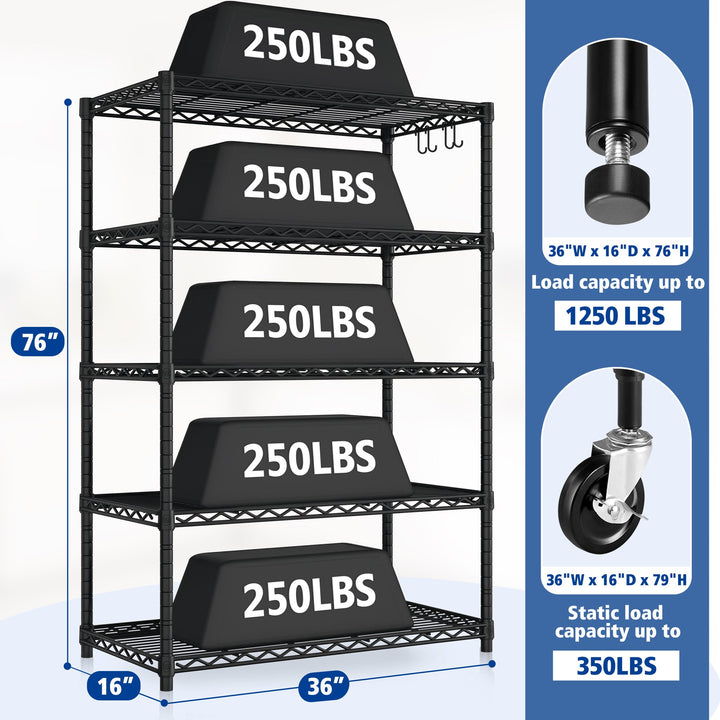 TrumanPick 5Tier Wire Shelving Unit, Adjustable Heavy Duty Steel Wire Rack for Kitchen, Garage, 36" W x 16" D x 76" H, Black