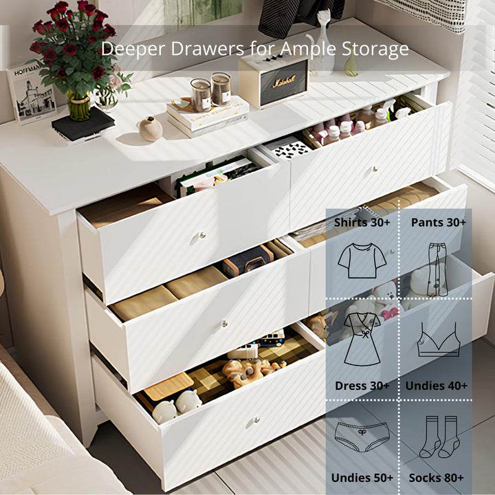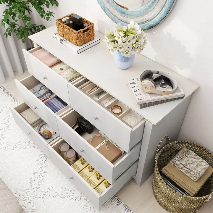 - 【Spacious Storage Space】With six large drawers, this white dresser provides ample space for classify clothes, cosmetics and other daily items, keeping your room tidy all the time. The spacious open tabletop serves as a great display area for decorative items and additional storage.