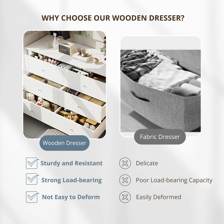 Simple to assemble, this white 6 drawer dresser brings generous storage space and sophisticated elegance to your room with little effort. Crafted from high-quality warp-resistant engineered wood with an oil-coated surface, the white dresser is wear-resistant and easy to clean. With clean lines and timeless silhouette, this wood dresser is compatible with different room styles and decors and accentuates the style of your home. Featuring 6 separate wooden drawers, this large dresser has ample private storage space while keeping everything neatly sorted. Smooth metal rails allow you to glide smoothly and access your items with ease. This white dresser for bedroom is wide and sturdy, with anti-tip fittings for excellent stability and long-term use. So why wait? Easily declutter your living space with our adult chest of drawers for bedroom.