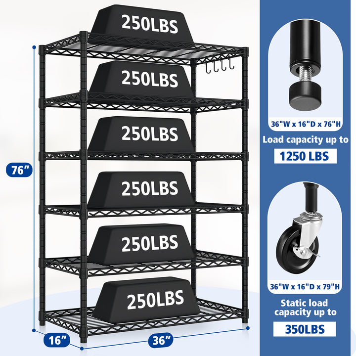 TrumanPick 6-Tier Wire Garage Storage Shelving Unit Heavy Duty Adjustable Wire Shelving Unit for Garage Kitchen, 36"W x 16"D x 76"H, Black