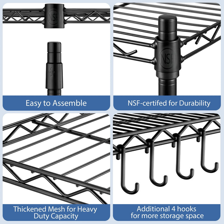 - 【Height adjustable & Flexible Assembly Metal Shelves】Enjoy the DIY fun brought by professionalism.The height of each wire shelf can be adjusted freely according to the height of your heavy-duty items.What’s more,you can purchase two storage shelves racks to form a horizontal wider type,so you get the width of three shelves to suit your needs!